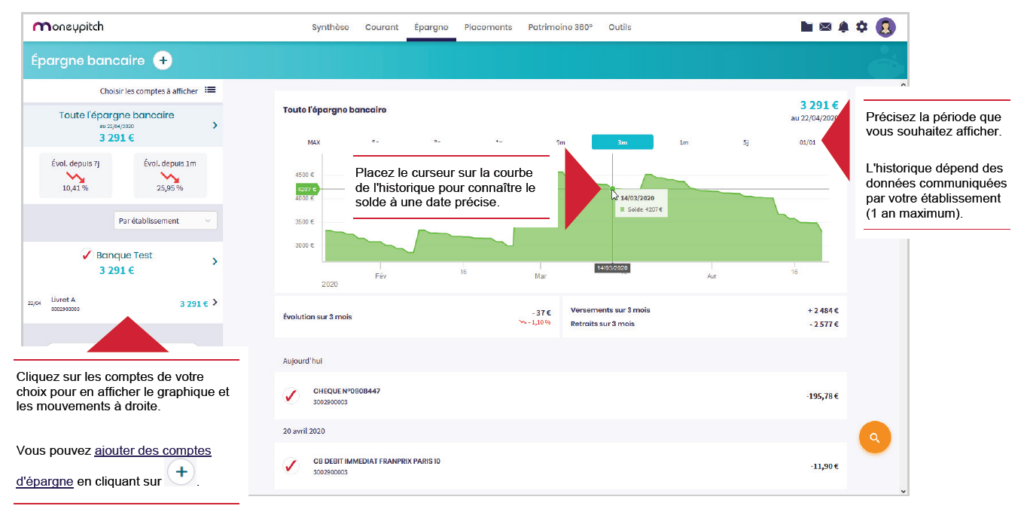 Consultez ici l’évolution de votre épargne bancaire et les mouvements associés.