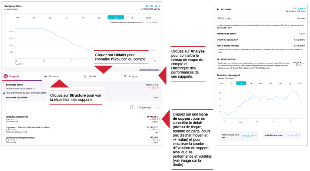 En cliquant sur chaque compte (dans le menu latéral gauche de l’écran principal), outre son évolution sur la période choisie, vous disposez du détail de ses supports, de sa structure, du gain réalisé ou de son taux d’évolution (dans l’onglet Détails) et d’une analyse financière qui présente le niveau de risque du compte et l’historique des performances de ses supports.