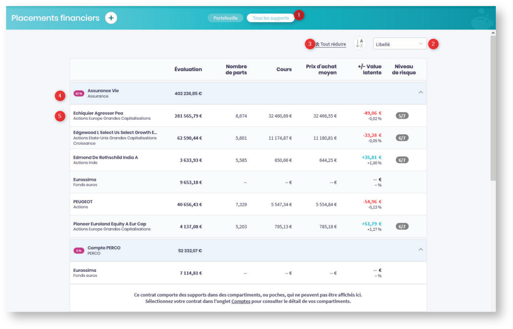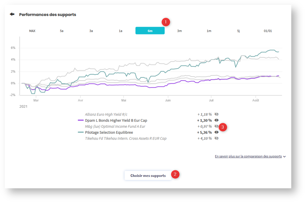 Vous pouvez également afficher/masquer les supports appartenant à vos différents contrats, pour clarifier l’affichage de la liste (3).