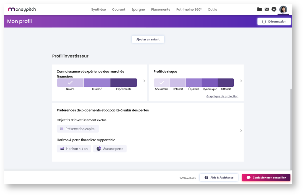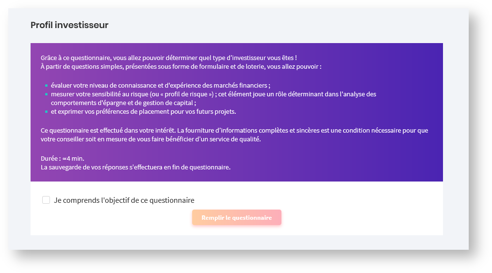 Avant de réaliser tout investissement financier, la détermination de votre profil d’investisseur, de vos connaissances et expérience des produits financiers et de vos préférences de placements et votre capacité à subir des pertes est obligatoire pour que votre conseiller puisse vous proposer des placements adaptés.
