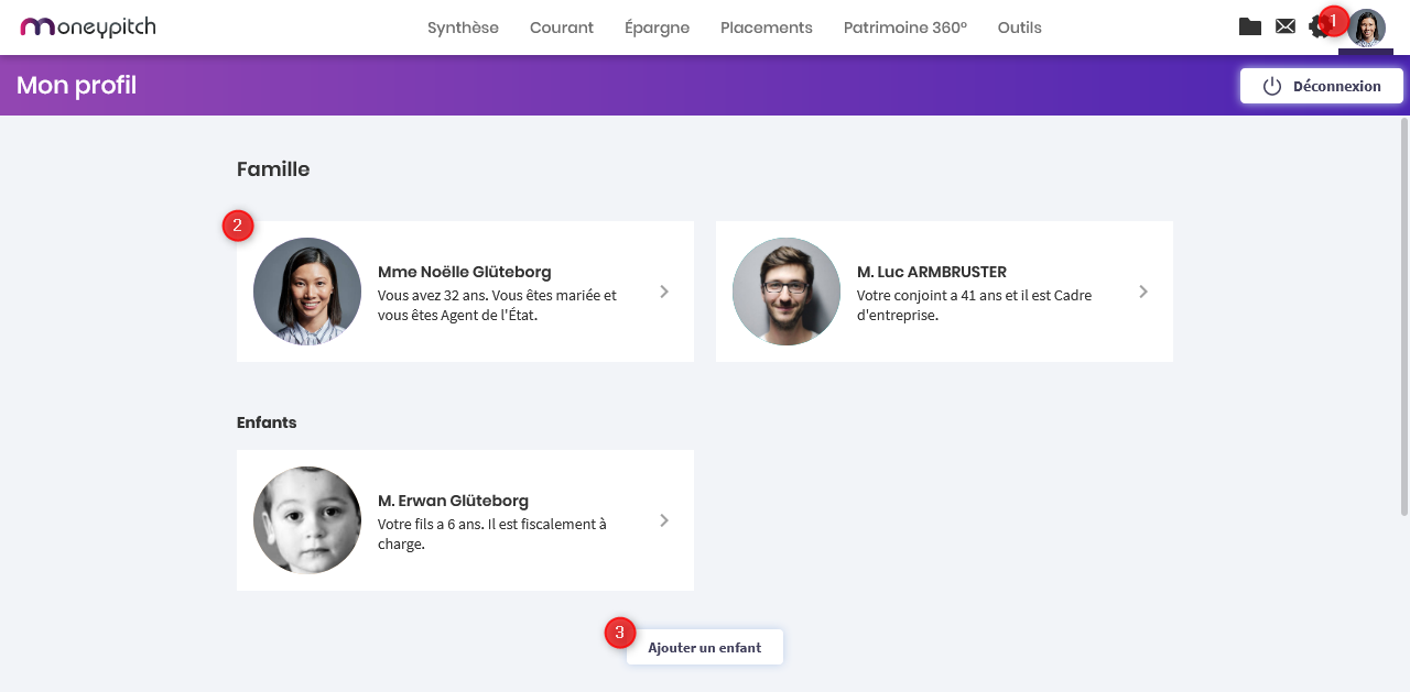 Complétez ici les informations relatives à votre état-civil, votre profession et votre départ en retraite, en cliquant sur la tuile (2) de votre profil. Ajouter vos enfants en cliquant sur le bouton dédié (3).