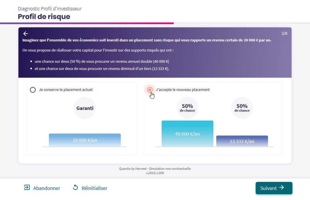 Pour déterminer ces 3 points, le questionnaire est découpé en 3 parties dans lesquelles une série de questions simples et rapides vous est posée. Il vous permettra ainsi de mieux déterminer votre sensibilité au risque (ou tolérance) afin de vous orienter vers des solutions de placements adaptées. Le comportement face à l’incertain joue un rôle déterminant dans l’analyse des comportements d’épargne et de gestion de capital.