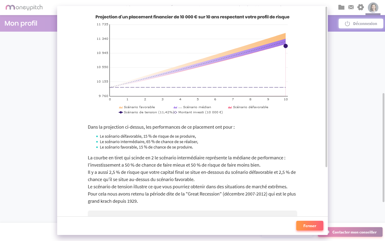 En cliquant sur le lien Graphique de projection dans l’encart du questionnaire Profil de risque, un graphique de projection d’un placement financier apparait. Il illustre plusieurs scénarios possible d’un placement de 100 000 € selon votre sensibilité au risque défini dans le questionnaire.